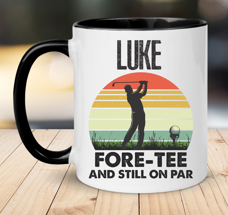 40th Birthday ceramic coffee mug personalised with a name and quote "Fore Tee and still on Par"